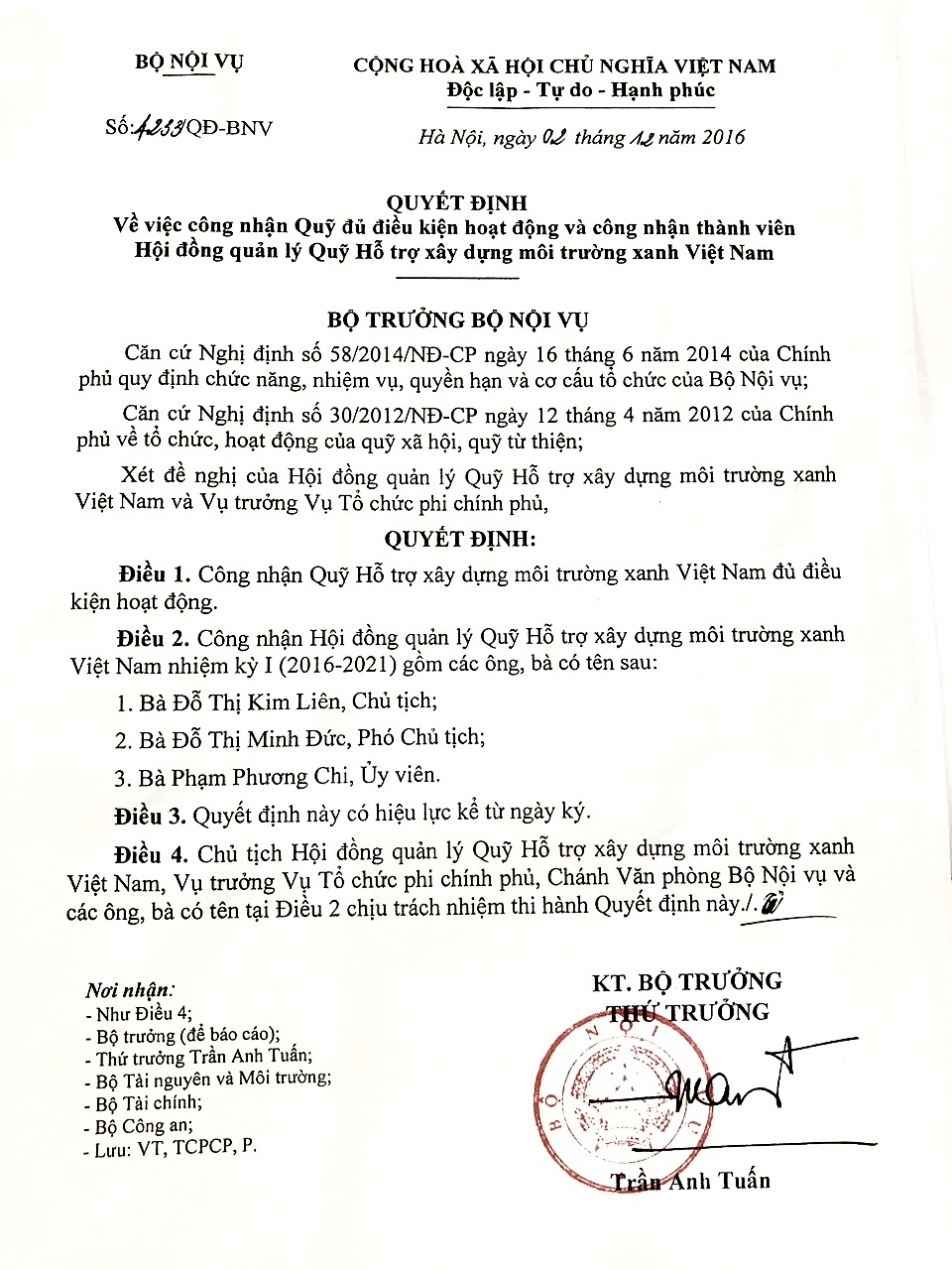 Quỹ Hỗ trợ Xây dựng Môi trường Xanh Việt Nam (Green Vietnam Fund) là Quỹ xã hội, được thành lập theo Quyết định số 1489/QĐ-BNV ngày 08 tháng 06 năm 2016 của Bộ trưởng Bộ Nội vụ.